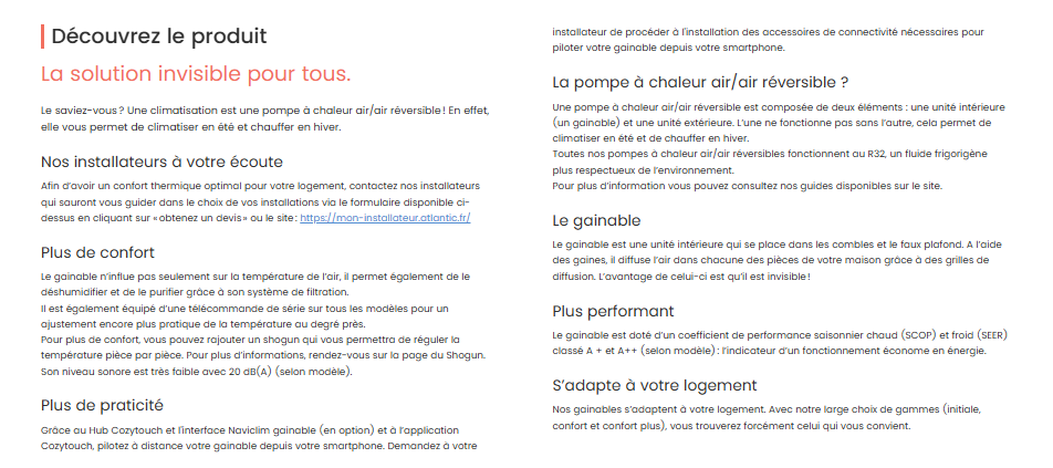 Découvrez le gainable compact Atlantic Confort R32, une pompe à chaleur Air/Air réversible invisible, idéale pour un confort optimal en toute discrétion grâce à son installation dans le faux-plafond.