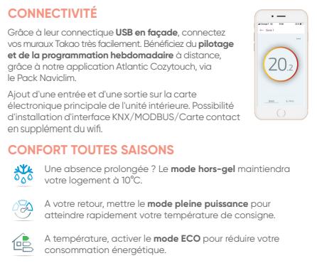 🔹 Confort toutes saisons : modes « hors gel » et « pleine puissance », large plage de fonctionnement