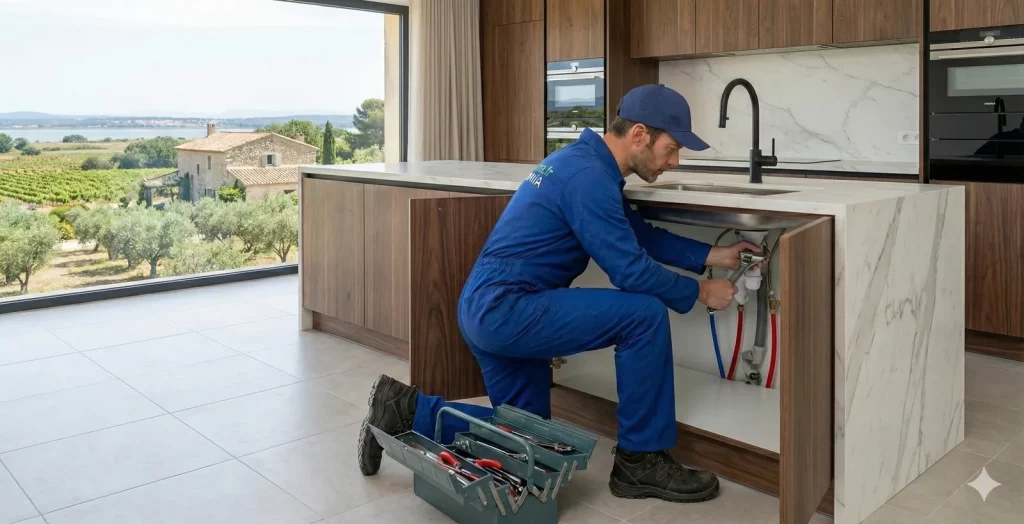 Voici les 12 signes d’alerte qui demandent un appel plombier a Mauguio : SIGNES VISUELS : Gouttes/humidite sous evier (fuite tuyauterie), tache d’humidite au plafond/mur (fuite dans les murs – appelez rapidement), rouille/corrosion visible tuyauterie, eau qui coule de radiateur, eau marron/rouille au robinet (corrosion interne), WC qui coule son continu. SIGNES SONORES : Bruit vibration/coup tuyauterie (coup de belier), siflement robinet, gargouillis canalisation (air emprisonne, bouchon approche). SIGNES FONCTIONNEMENT : Eau s’ecoule tres lentement (bouchon partiel), pression eau faible partout (fuite cachee possible), absence eau chaude subite. QUAND APPELER IMMEDIATEMENT : fuite massive/inondation, absence d’eau totale, odeur gaz. QUAND APPELER SOUS 24-48H : fuite moderee, WC qui coule, radiateur qui fuit. Doute ? Appelez , on parle 2 min gratuitement. Mieux appeler pour rien que laisser fuite s’aggraver.